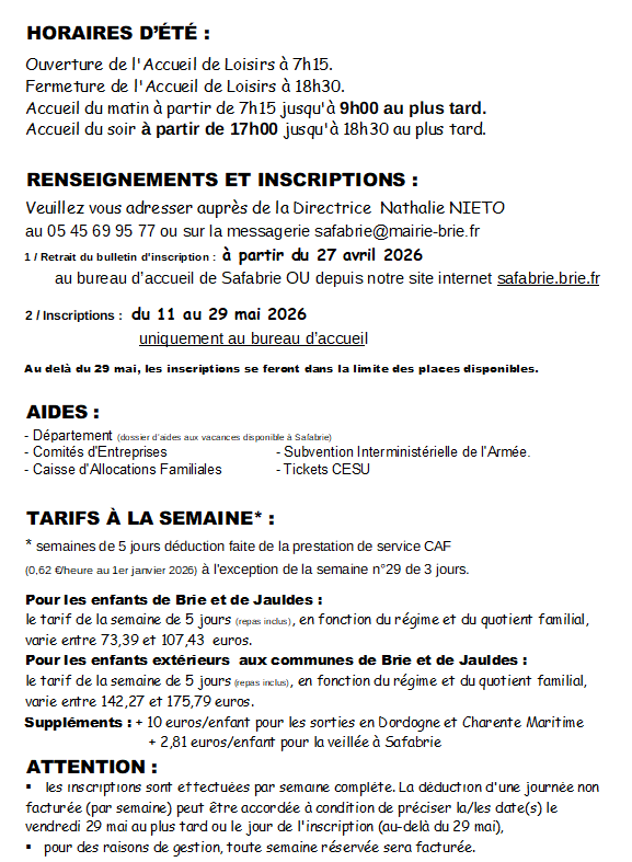75 route de la PrévôterieLe bourg16590 BRIETél : 05.45.69.95.77safabrie@mairie-brie.fr